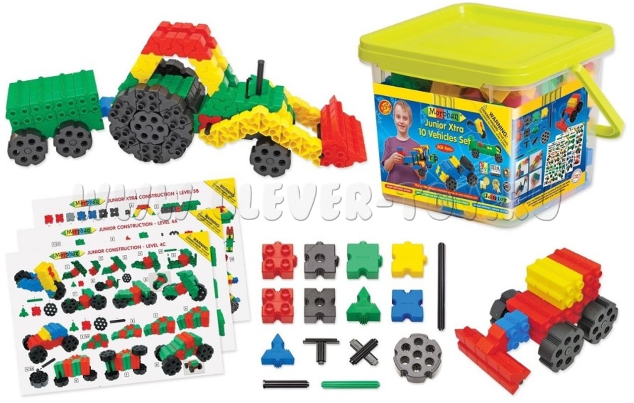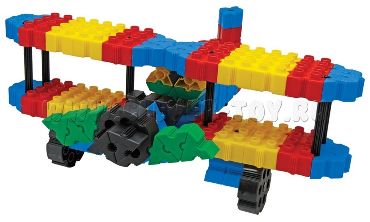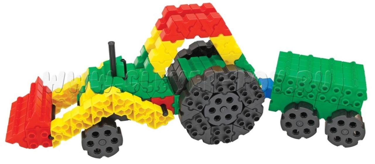 Комплектация: онструктор состоит из 251 пластмассовых деталей: "T"- и "Г"-образные элементы, квадраты, треугольники, колеса, соединительные и направляющие элементы.