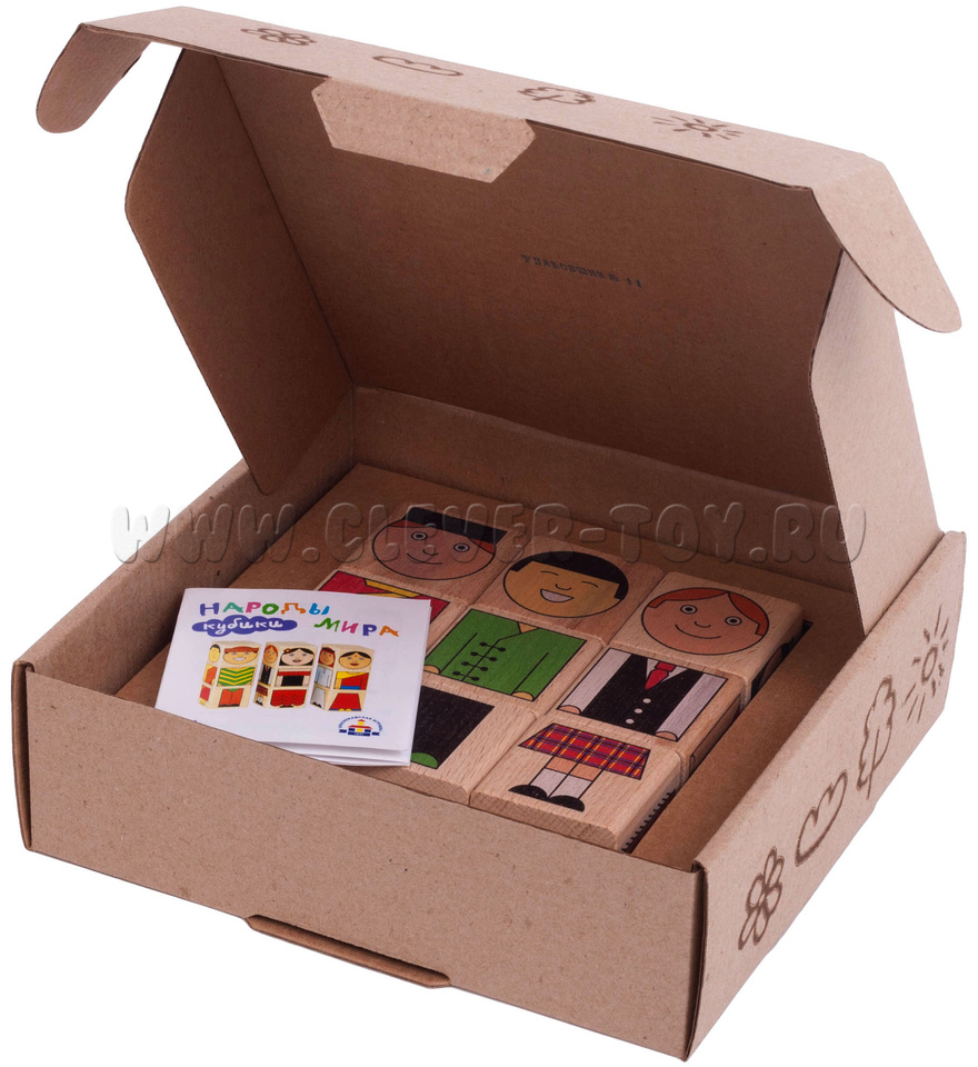 В комплект входит 9 деревянных кубиков. На 4-х гранях каждого кубика нанесена яркая картинка – часть тела забавных человечков разных национальностей. Картинки расположены таким образом, что можно ставить кубики друг на друга, чтобы получался вертикальный «кубический человечек».