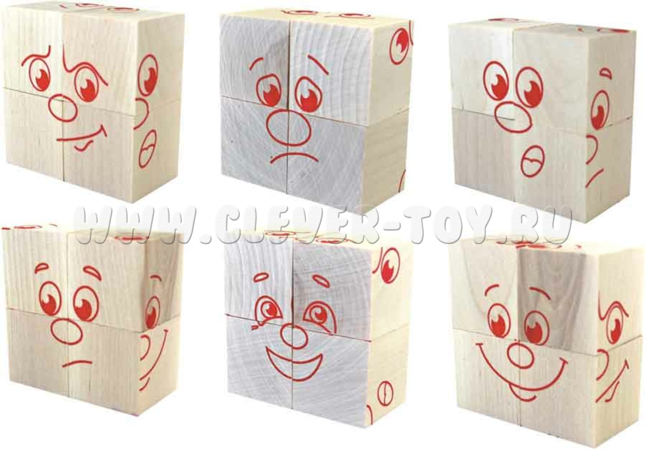 В состав входит четыре кубика, из которых ребенок может собрать 6 изображений, передающих настроение.