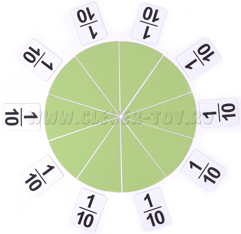 В наборе 36 магнитных карточек. Состав в описании изделия. 18 карточек - цветные части круга (от 1 до 1/10). 18 белых карточек с указанием величины дроби (от 1 до 1/10). Диаметр пособия в собранном виде 27 см.