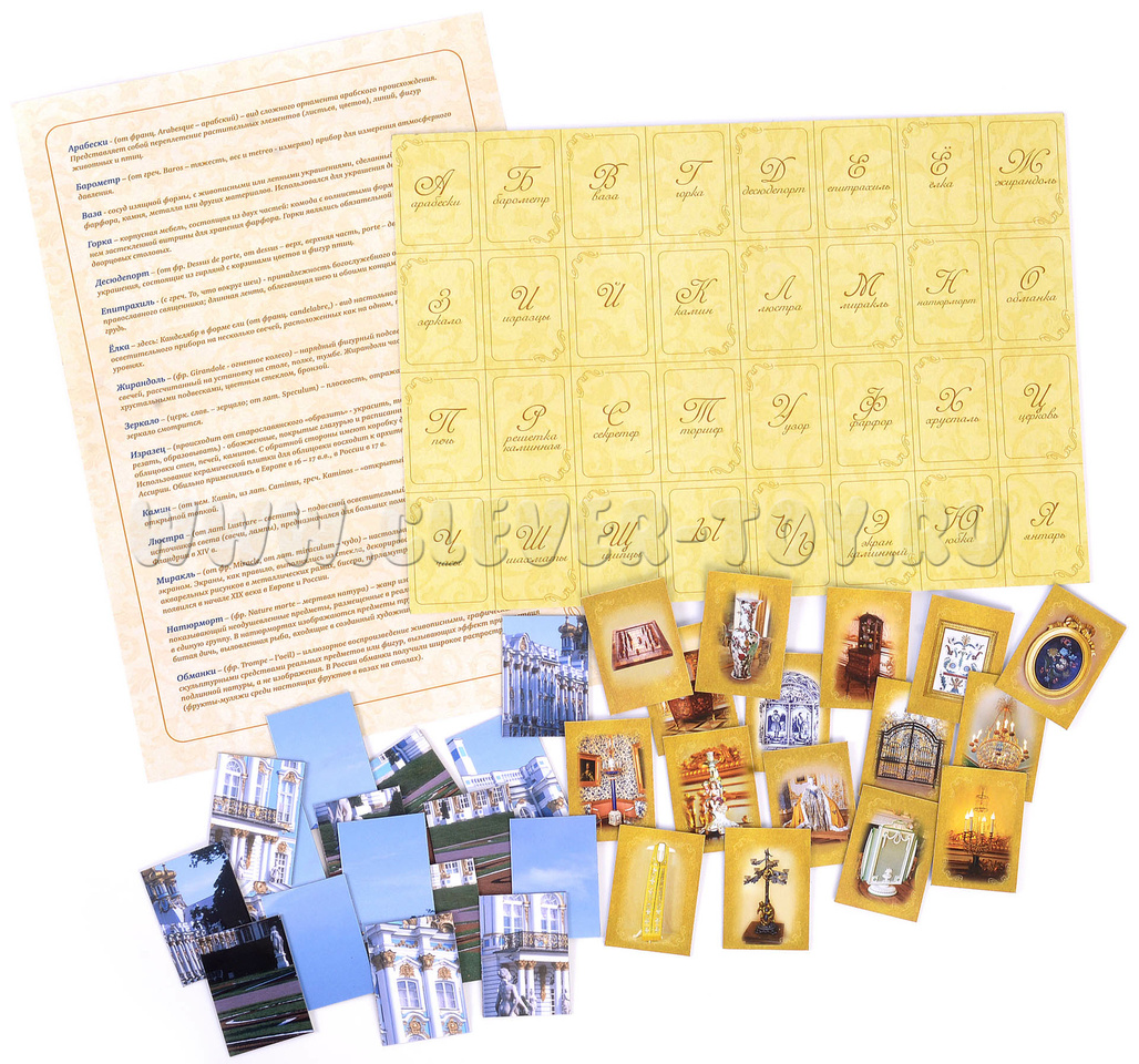 С помощью нашего магнитного алфавита вы сможете узнать, какие великолепные вещи окружали прежде хозяев Екатерининского дворца (Царское Село, Санкт-Петербург) - русских императоров и императриц. Названия некоторых предметов вам наверняка знакомы, а какие-то вы встретите впервые. Постарайтесь их запомнить!