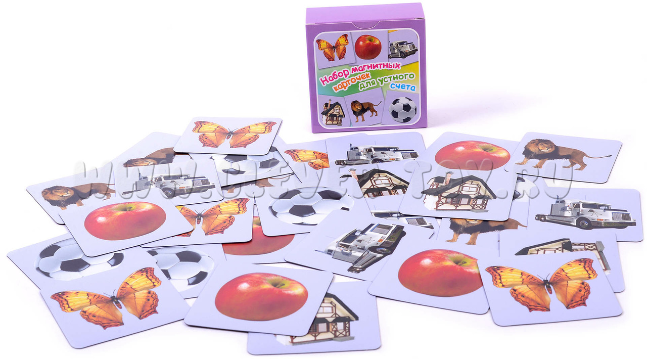 В наборе 30 карточек. Изображены 6 предметов: дом, яблоко, машина, лев, мяч, бабочка.