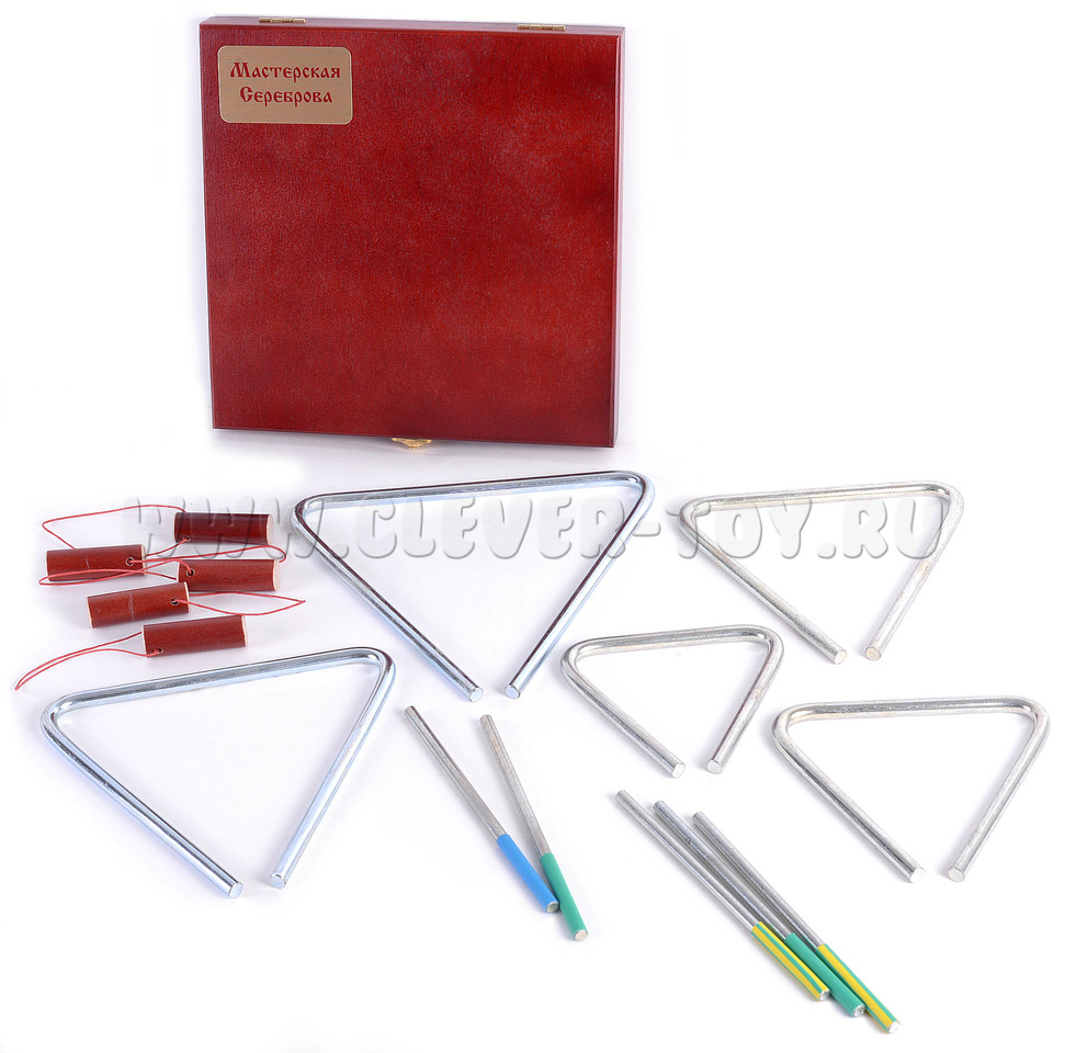 5 музыкальных треугольников (длина стороны - 10, 12, 14, 16, 18см) с качественной тембральной окраской, благородным и певучим звуком (до 20 секунд).