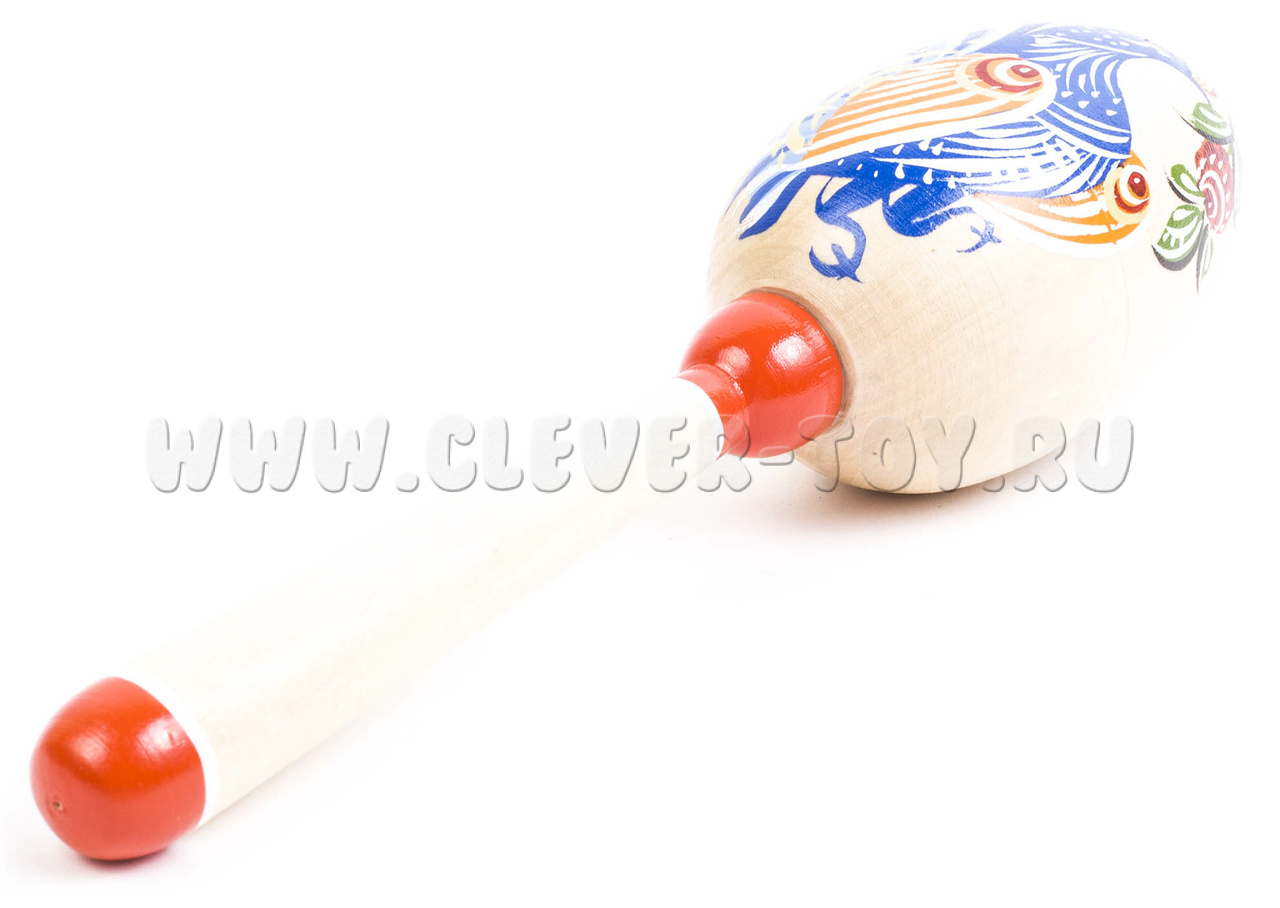 Погремушка представляет собой пустотелый деревянный предмет яйцеобразной формы. Внутрь погремушки засыпана охотничья дробь. В нижней части погремушки крепится фигурная ручка токарной работы. Материал: липа.