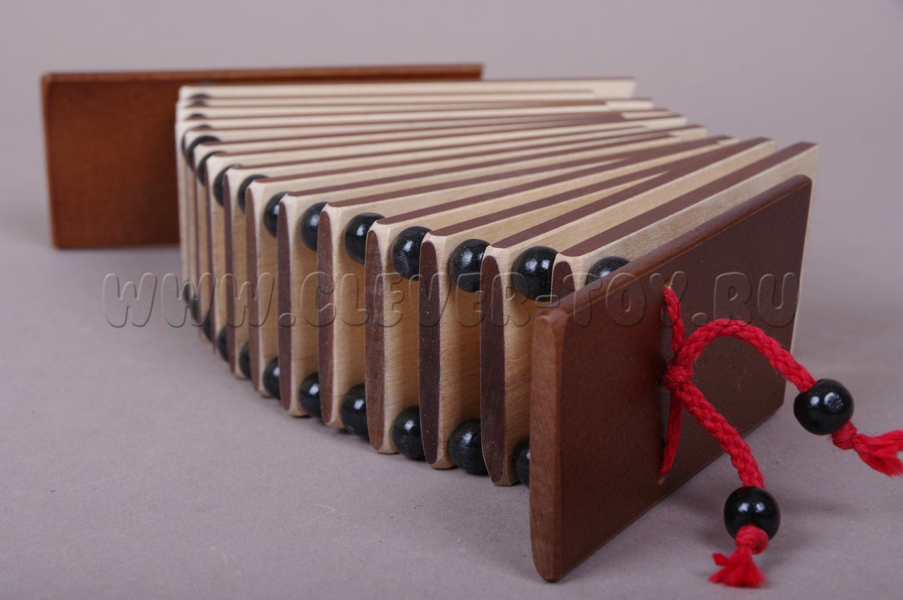 Трещотка представляет собой деревянные пластины, соединенные капроновой нитью через перемычки в форме шариков диаметром 4 мм. Пластины изготовлены из березы. Крайние пластины выдвинуты вверх на 40 мм для удобного захвата при игре. На концах капроновой нити крепятся по два деревянных шарика. Размеры: длина пластины 100 мм, ширина 40 мм, толщина 5 мм. Количество пластин: 17 шт.