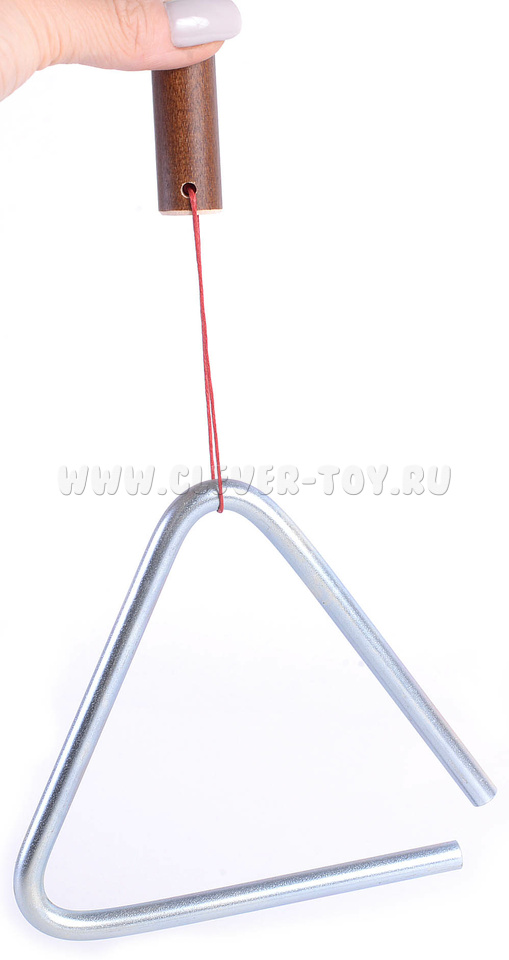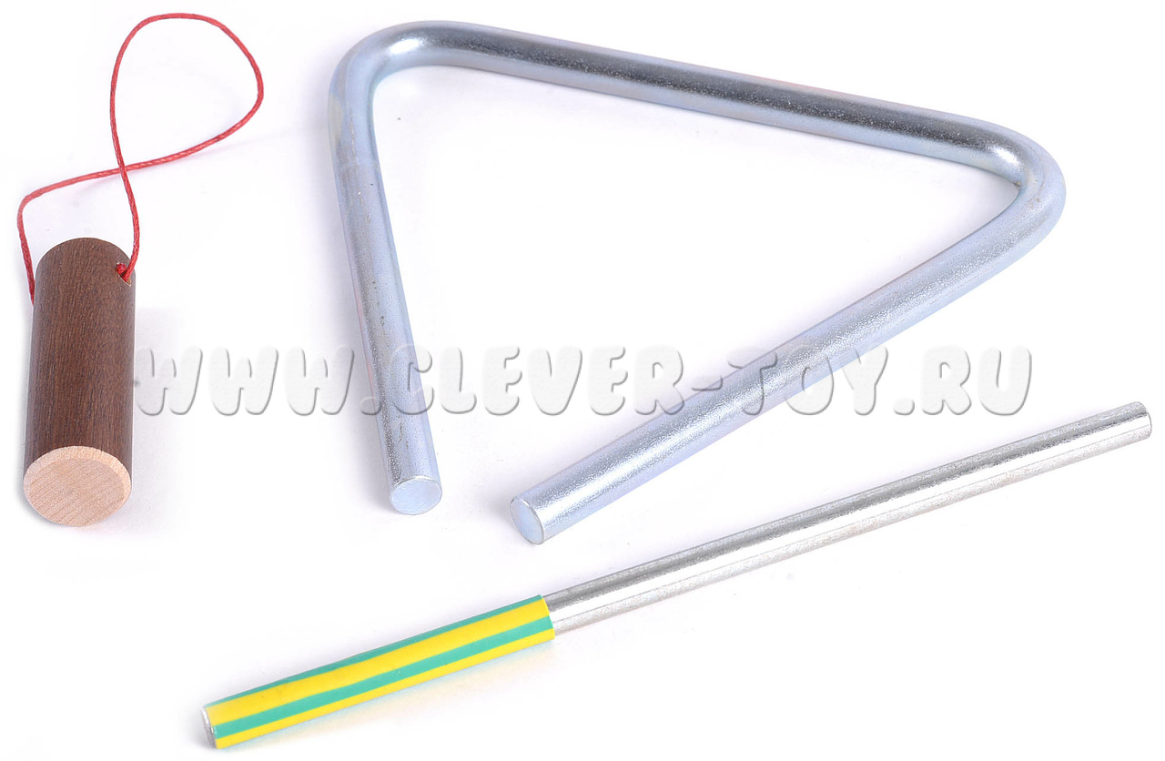 Треугольник выполнен из стали диаметром 8мм, длина стороны - 12см. Гальваническое покрытие не ухудшает качество звука и не разрушается при механическом воздействии. Ударная палочка из нержавеющей стали.
