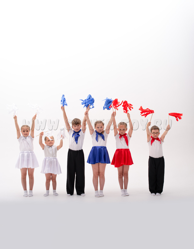 - Набор для танца "Юбка + Галстук": 4 комплекта белого, 4 красного и 4 синего цвета (всего 12 полных комплектов). Идеально для выступления трёх цветовых групп.