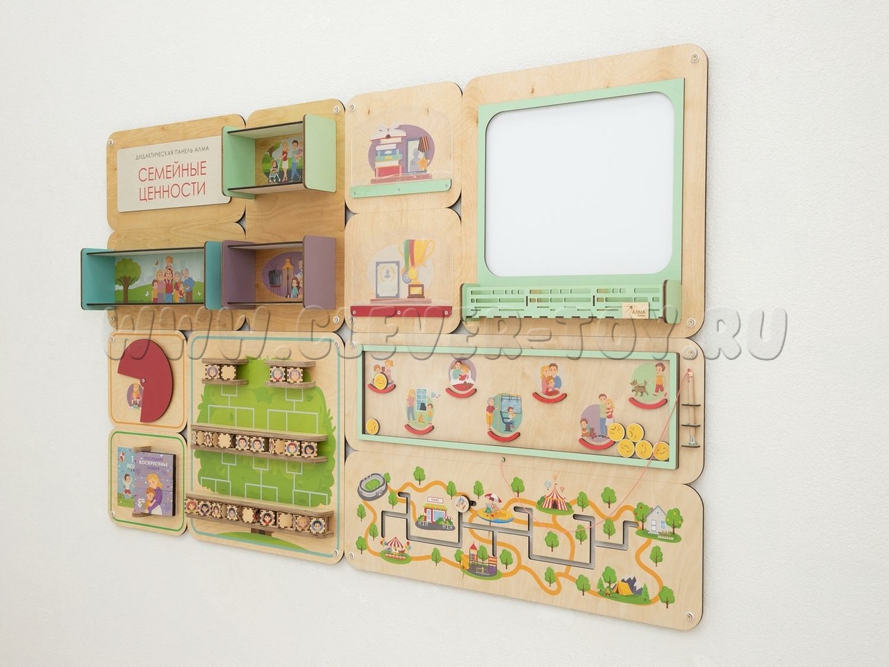 Элементы игровой настенной панели включают иллюстрации, развивающие игры и познавательные задания, которые отражают семейные ценности. Содержание блоков направлено на формирование у дошкольников любви к членам своей семьи, изучение истории своего рода, уважение представителей разных поколений, а также на создание и активное участие в семейных традициях и праздниках.