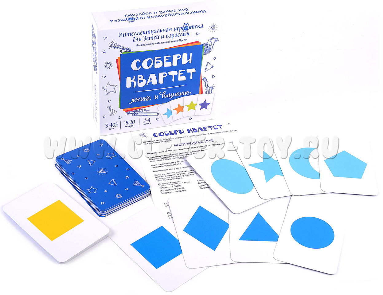В набор входит инструкция с правилами игры и 32 карточки с изображениями 8 геометрических фигур разных цветов.
