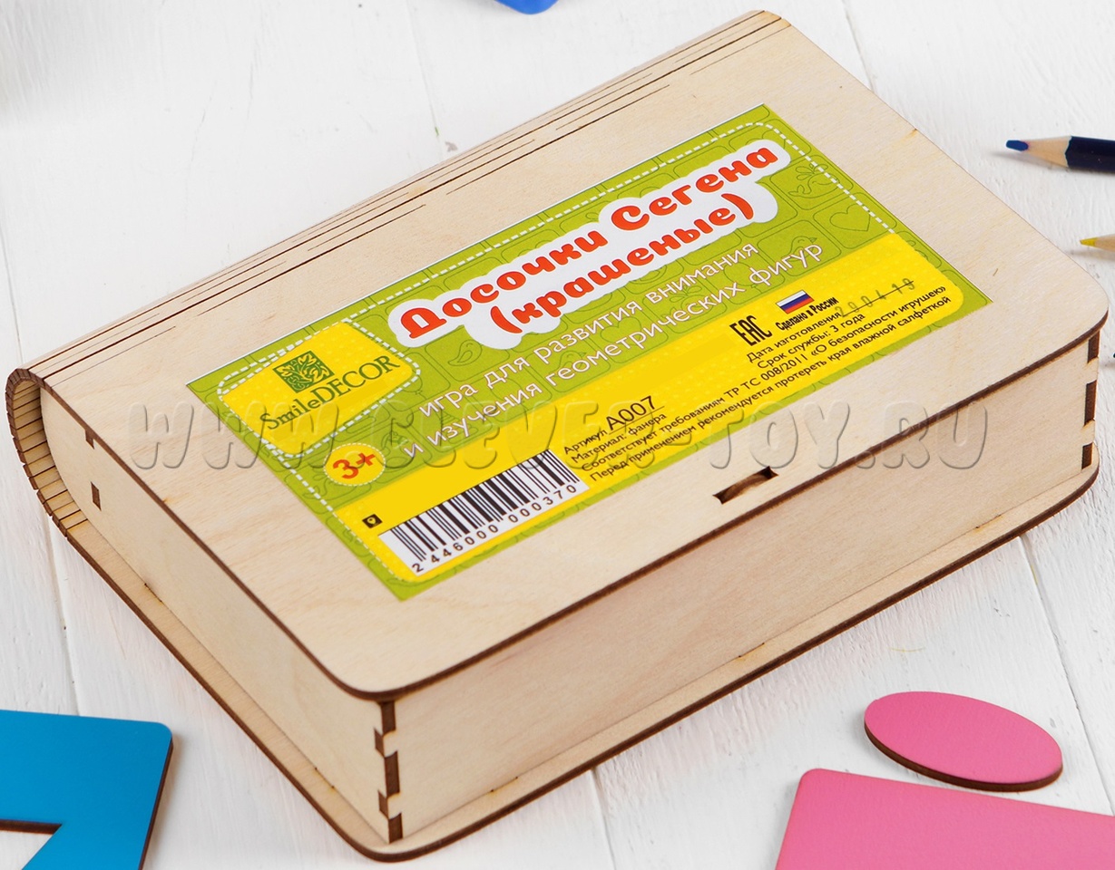 В комплект входят 18 планшеток с выемками в виде квадратных, овальных, круглых, прямоугольных, ромбовидных и треугольных форм.