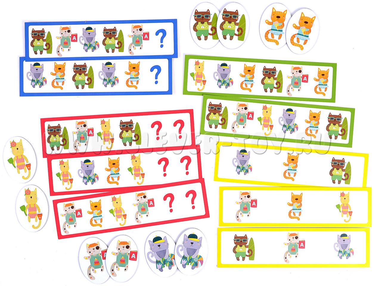 - Игра для поля с шезлонгами (обратная сторона игрового поля). Начинайте с заданий в зеленой рамке: воспроизводите заданную карточкой последовательность котят. Более сложные задания предлагают не только продолжить ряд, но и установить взаимосвязь и закончить последовательность самостоятельно. К этим заданиям стоит переходить, когда малыш уверенно справляется с зелеными карточками.