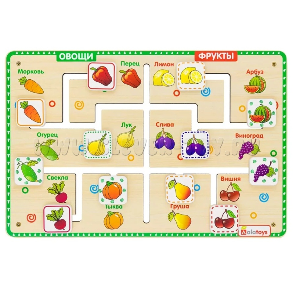 Фишки с рисунками двигаются по пазам на доске с изображением фруктов и овощей. Каждая фишка-картинка должна оказаться рядом с соответствующим рисунком.