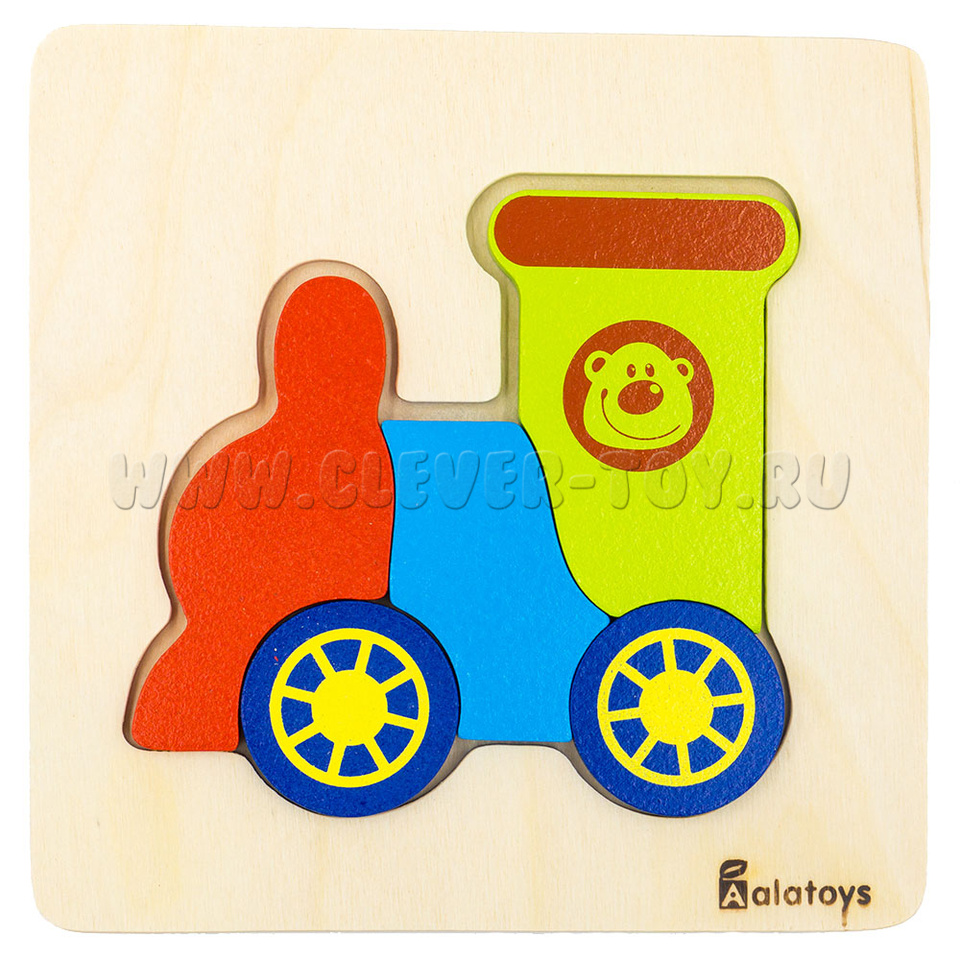 Пазл «Паровозик» представляет собой деревянную основу с углублениями для размещения деталей паровозика. Только правильно подобрав детали по форме и размеру, у ребёнка получится сложить правильные пазлы.
