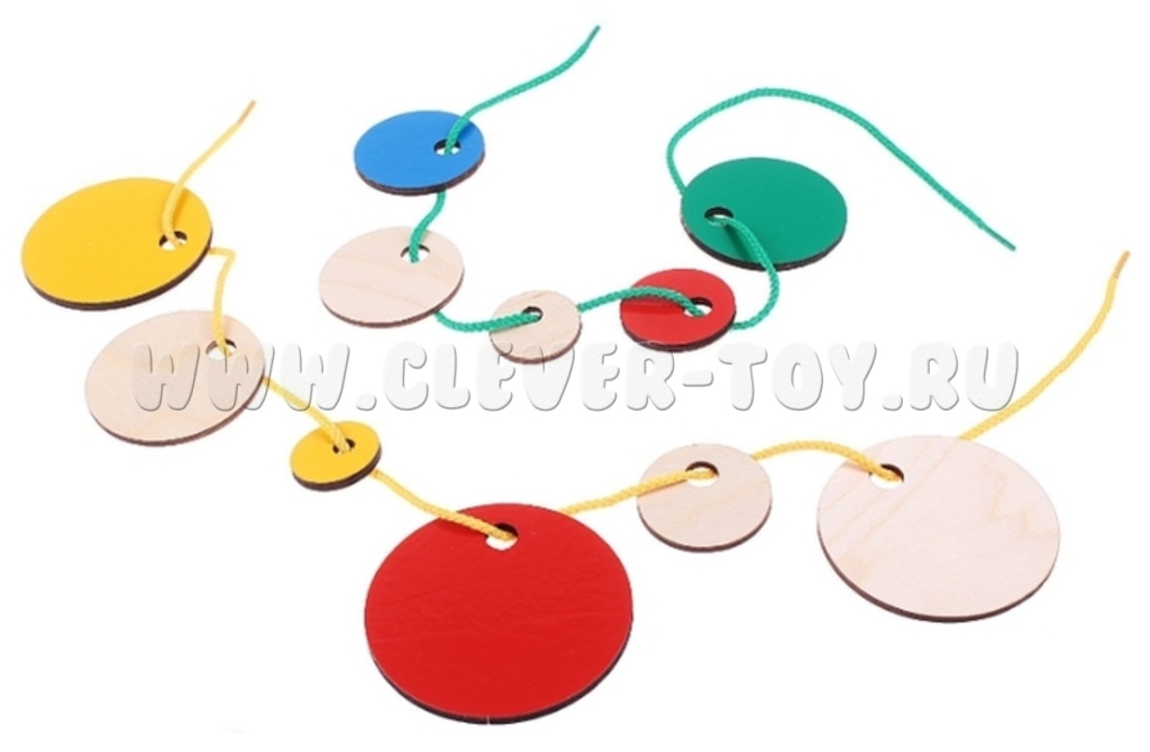 Планшет в который вкладываются разноцветные вкладыши в форме круга. Вкладыши окрашены в разные цвета и имеют разный размер, в каждом есть отверстие для продевания шнурков. Шнурки прилагаются к игре.