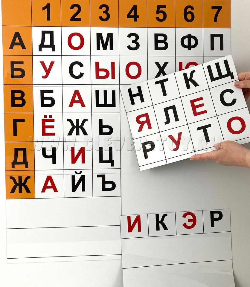 В комплекте 71 магнитные карточка с буквами, 1 пустая карточка, 30 магнитных смайлов.