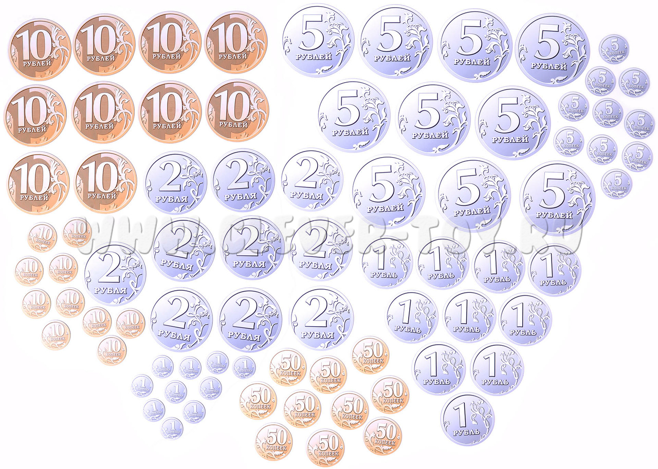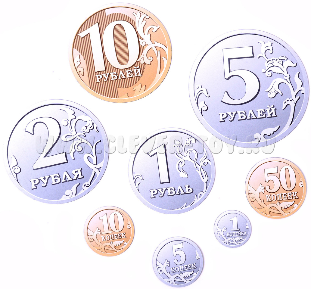 В комплект входит 80 магнитных карточек, которые представляют собой реалистичные изображения монет. В наборе вы найдёте по 10 карточек каждого номинала: от копеечных до десятирублёвых монет. Такой богатый ассортимент позволяет создавать самые разнообразные математические задачи и игровые ситуации.