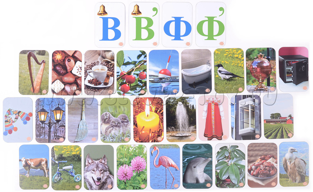 В, Ф, Ванна, Ворона, Волк, поплавок, самовар, корова; Фламинго, Фонарь, Фонтан, лифт, арфа, сарафан, шарф, сейф, гриф; Вишня, Веник, Велосипед, клевер, совята, свеча; Финики, Ферма, Фикус, конфеты, кофе, дельфин.