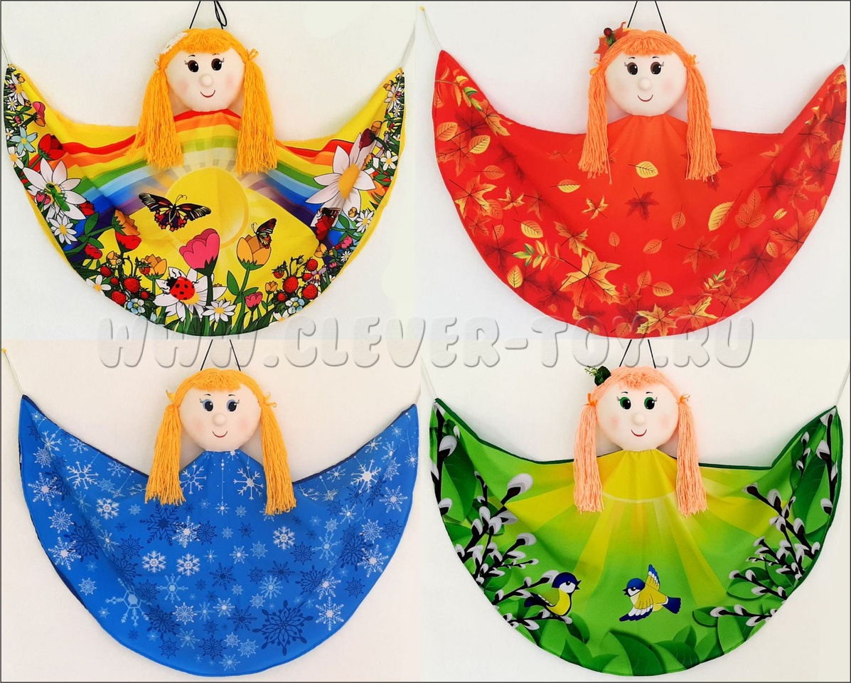 В набор входят платковые куклы по временам года: зима, весна, лето и осень.