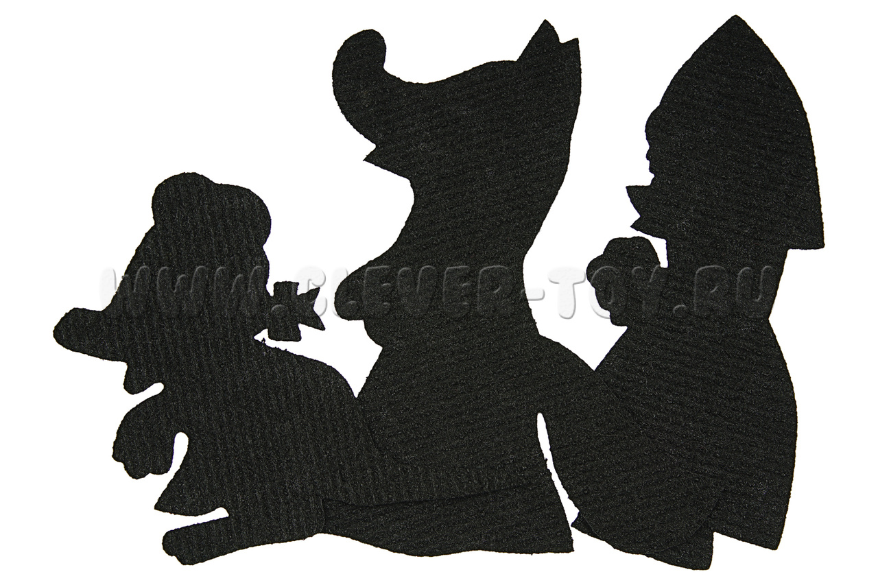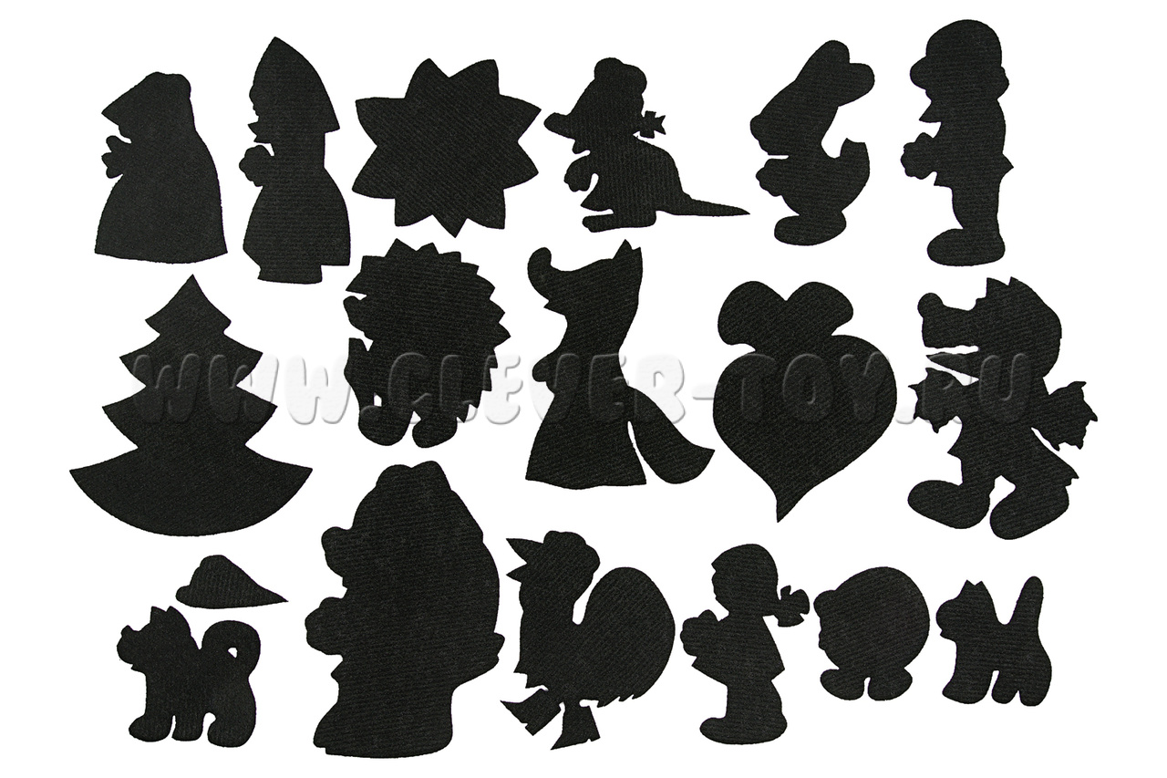 • персонажи сказок, выполненные в форме фигурок-теней: дед, бабка, внучка, мышка, собачка, кот, заяц, ёжик, лягушка, лиса, волк, петух, курица, колобок, медведь, мышь;